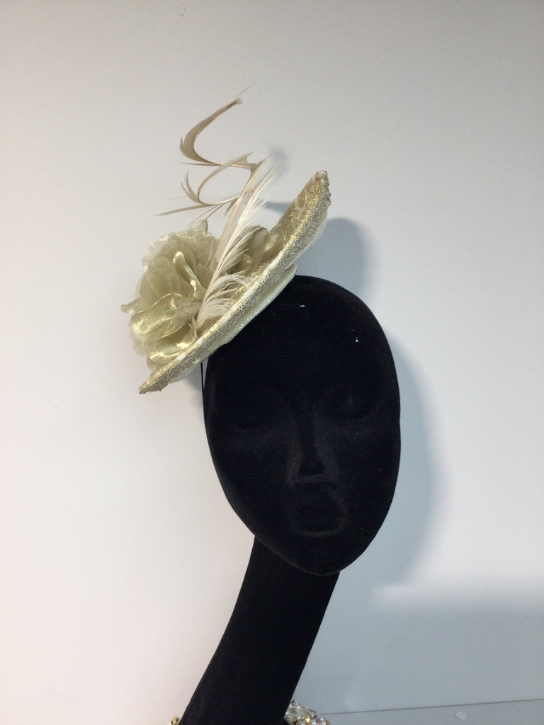 Off white base, trimmed with gold lace details. Delicate Gold Flowers & Ivory feathers give height & definition to this beautiful piece.