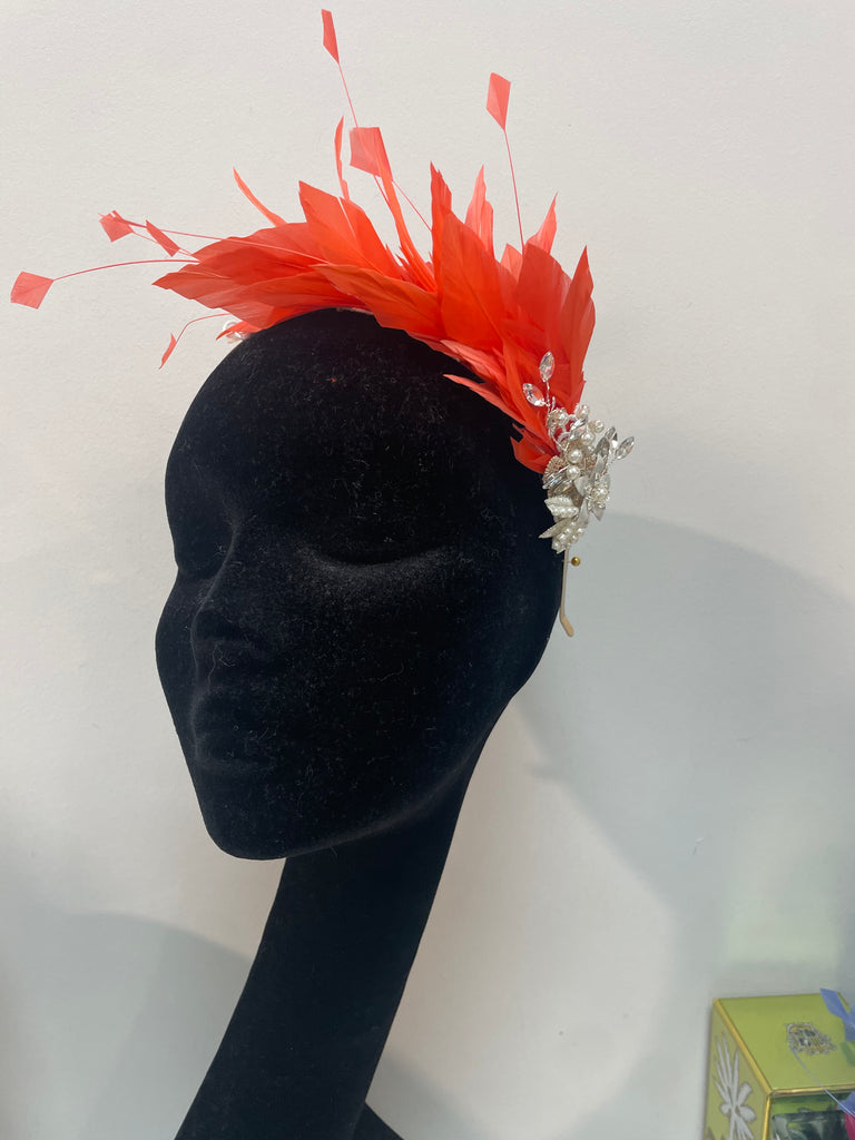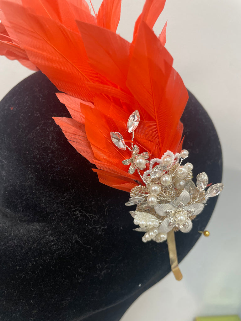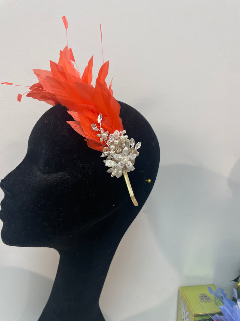 This is a beautiful coral feather headpiece on a silver band with rose gold lace trims and pearls and crystals details.