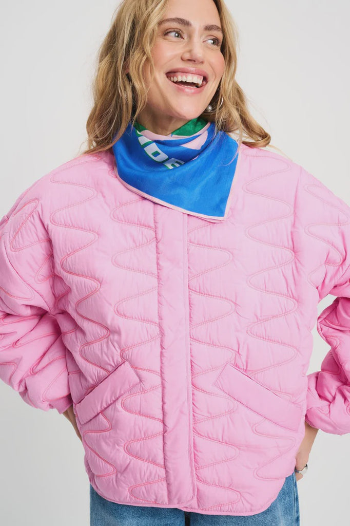This small 100% silk scarf combines blue, pink and green in a cheerful design featuring palm trees and waves. Light and versatile, wear it casually around your neck, in your hair or tied to your bag.