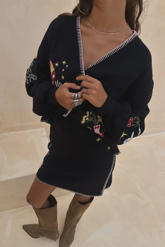 This fun take on the staple black cardigan will elevate any outfit, featuring combinations of our iconic leopard, mystical, poppy and bandana motifs from our bestselling prints. A knit base we are truly proud of - a soft touch base, in a slightly boxy fit, that feels so weighty and luxe. With contrast pink blanket stitch detailing along the sleeves and neckline that elevates the simple silhouette even further, making it an easy styling essential.