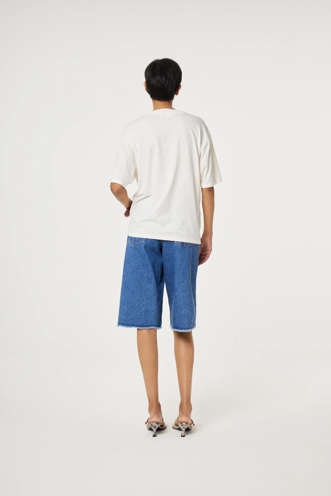 This t-shirt features a clean, oversized silhouette with a classic crew neckline and relaxed wide sleeves. The design is centered by a vibrant, graphic print. Pair it with neutral trousers for a modern look, or style it with your favorite denim shorts for a simple yet fun summer outfit.