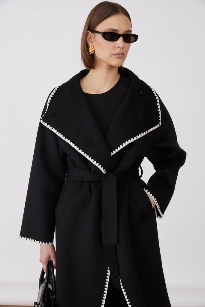 The 50% wool Douvres Coat features a wide open neck with an adjustable design, allowing for a personalized and comfortable fit. Highlighted by elegant white contrasting stitching, it offers a refined detail that enhances its sophisticated appeal. Perfect for layering, this coat combines style and functionality seamlessly.