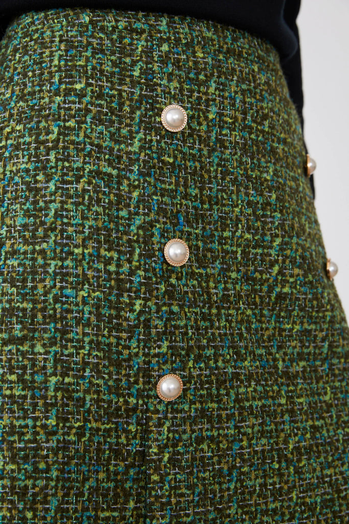Elevate your wardrobe with the CAPPA Skirt, featuring a refined green tweed-style fabric that exudes timeless sophistication. Delicate pearl buttons run subtly down the sides of the front, adding a touch of elegance and unique charm to your ensemble. Perfect for both professional settings and stylish outings, this skirt combines classic texture with understated detail for a polished, graceful look.