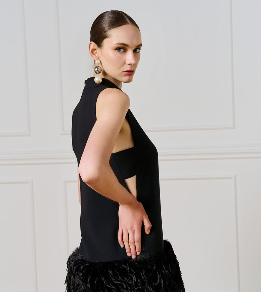 Long sleeveless top with high neckline and impressive feather-trimmed hem. It features side slits and back zip closure.