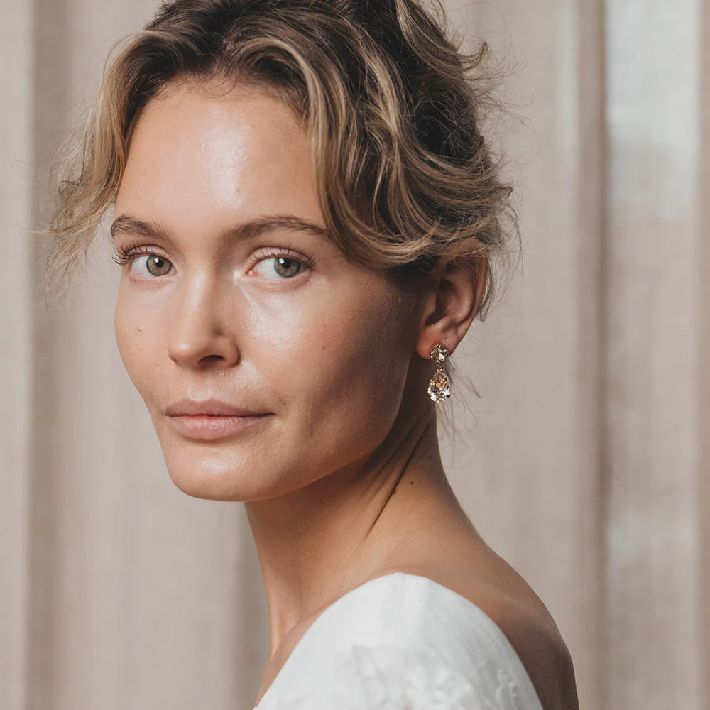 These delicate Mini Drop Earrings has our signature shape and define feminine sophistication, and everyone looks beautiful in them. Mini Drop Earrings is perfect as ”to go” accessory and everyone should own a pair in their jewelry wardrobe. Adorned with Gold Silk Swarovski Crystals.