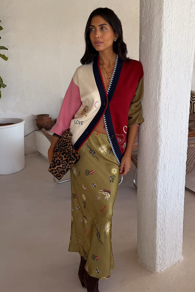 Our bestselling knits are weighty, soft touch and a definite wardrobe staple! We're starting the new year with a new edition of our mystical print, featuringembroidered motifs on a multicoloured base. With contrast blanket stitching on the hems adding an additional touch of texture, it's the perfect feel good throw on!