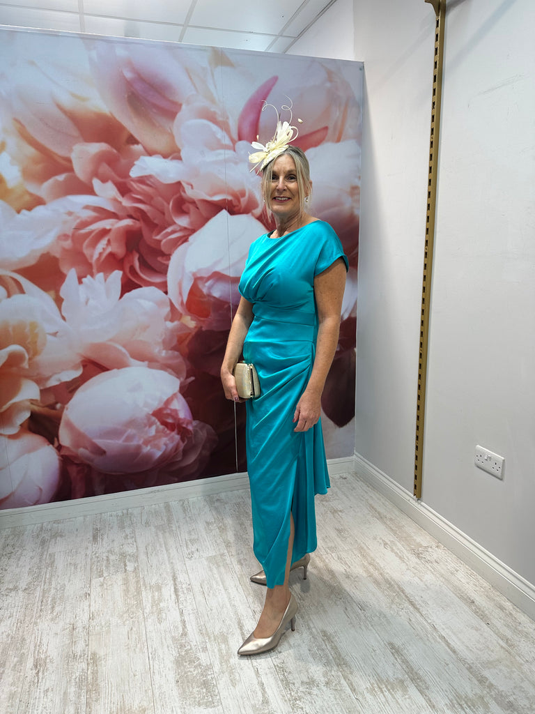 Satin effect pencil dress in turquoise with floaty overlay. Cap sleeve.